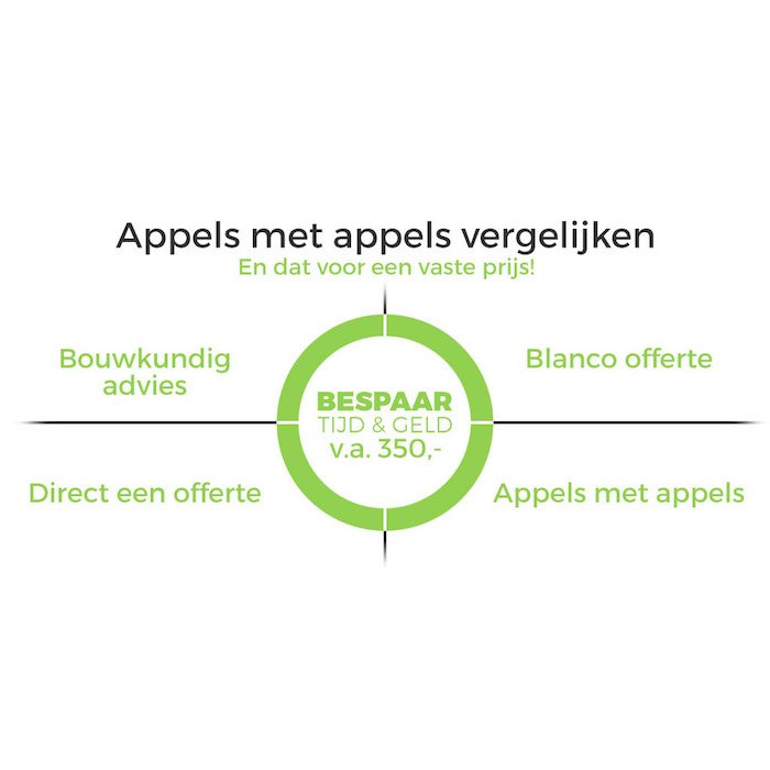 Met het appels met appels vergelijk krijgt u niet alleen bouwkundig advies, u bespaard tijd én geld. Dit doet u door vervelende meerwerkkosten te voorkomen en toch aan uw wensen te voldoen.